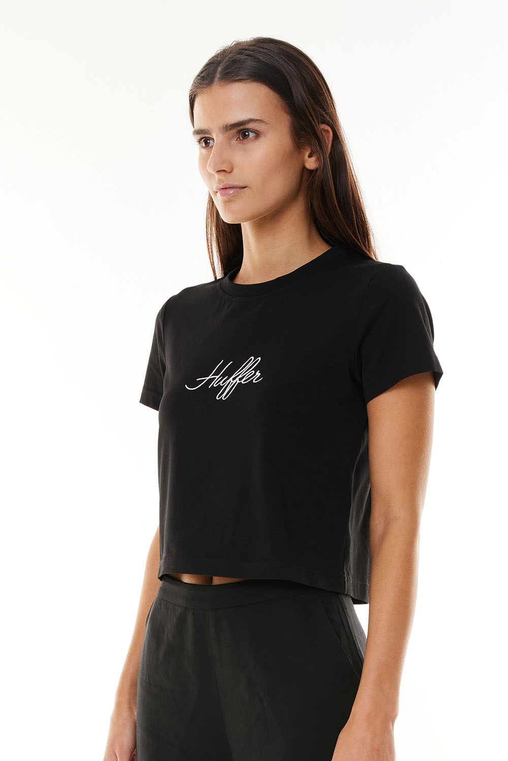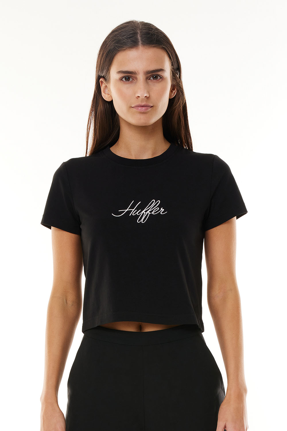 Product Description 97% Cotton 3% Elastane 186gsm Fitted Cap sleeve Crop length Huffer branded embroidery