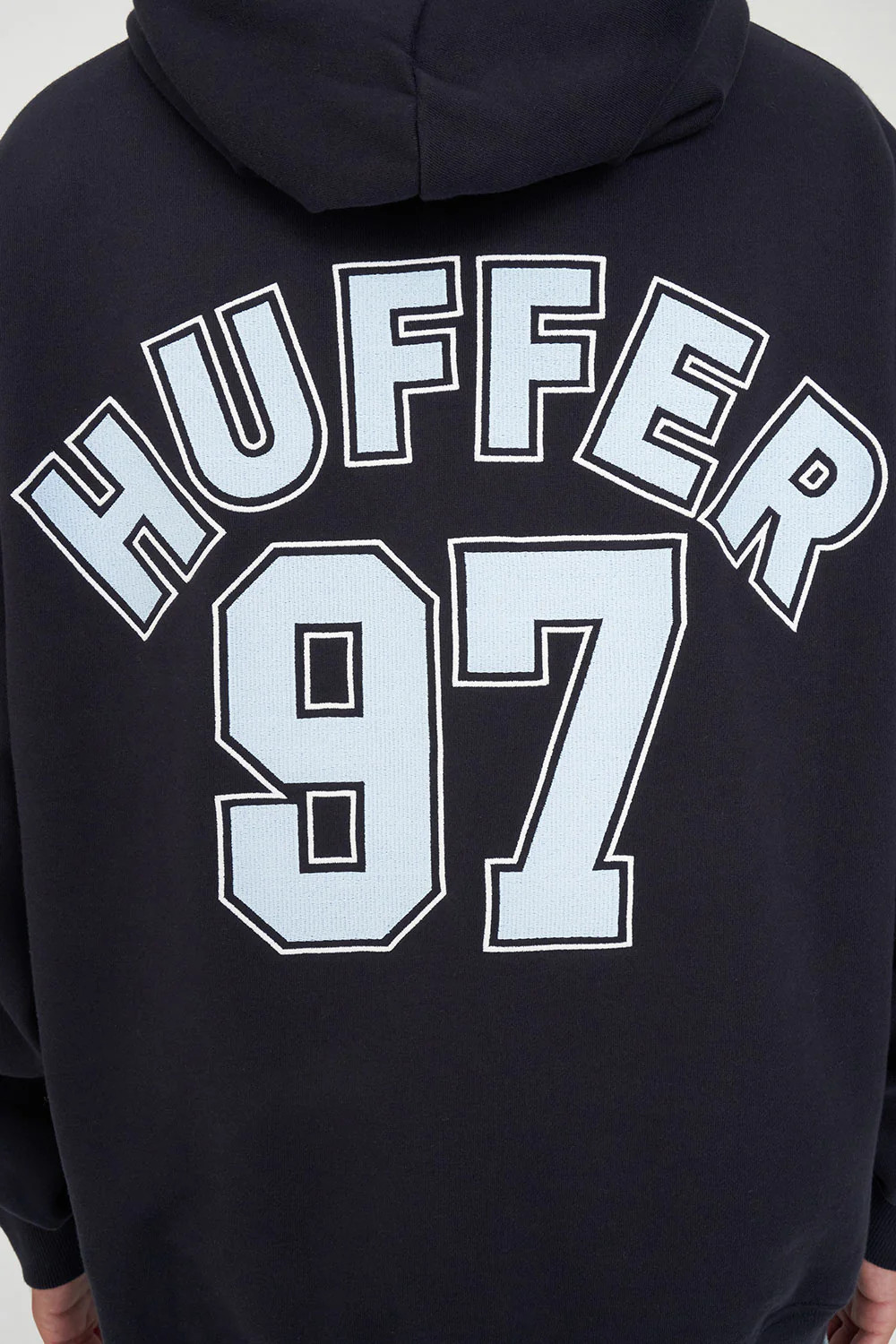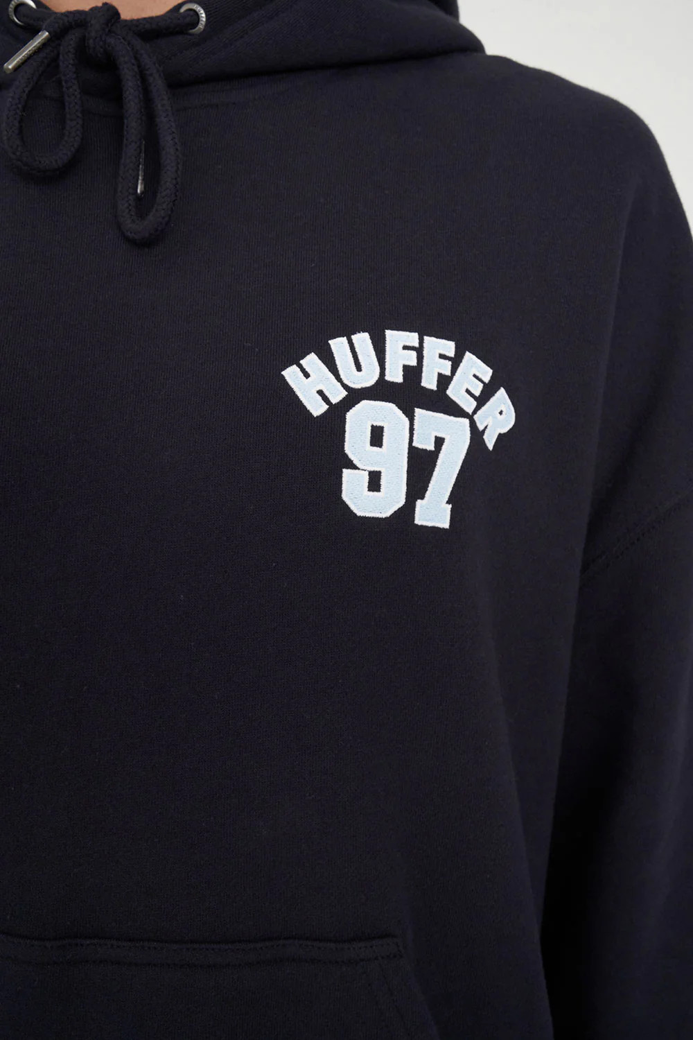• What you need to know: 100% Cotton, 350gsm, Mid-weight brushback fleece, Custom Huffer colour, Boxy fit, Kangaroo pocket, Huffer branded hardware, Huffer branded placement embroidery
