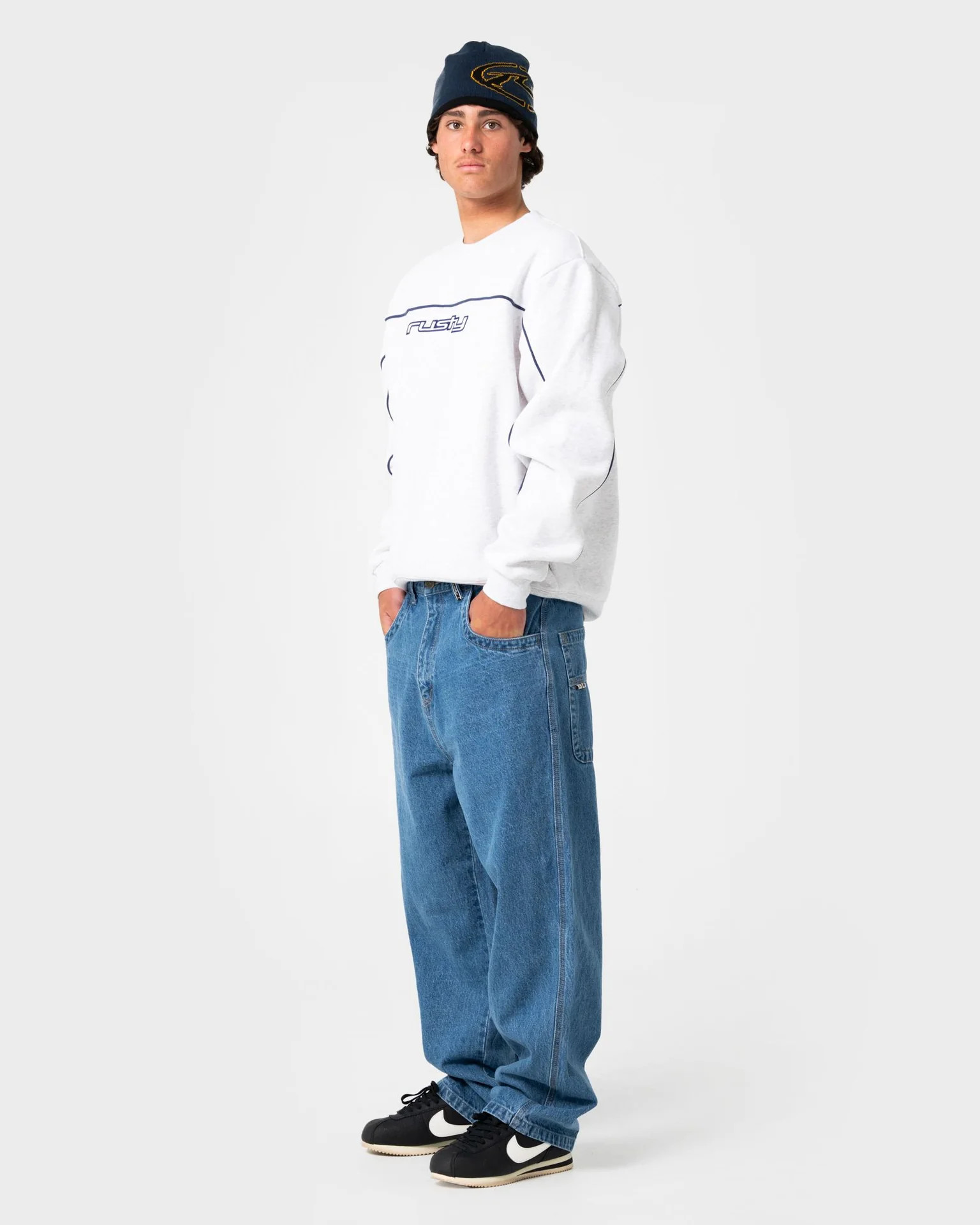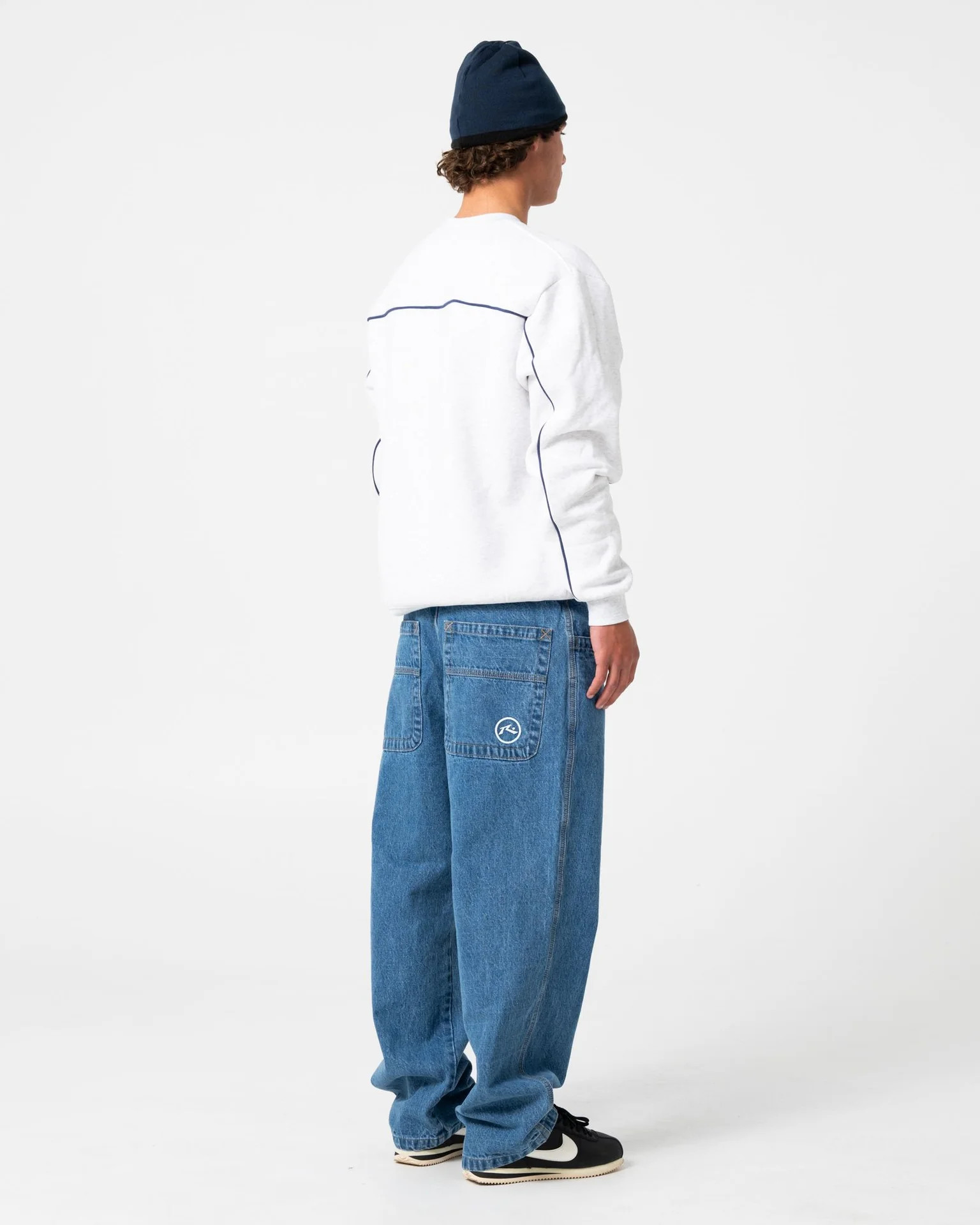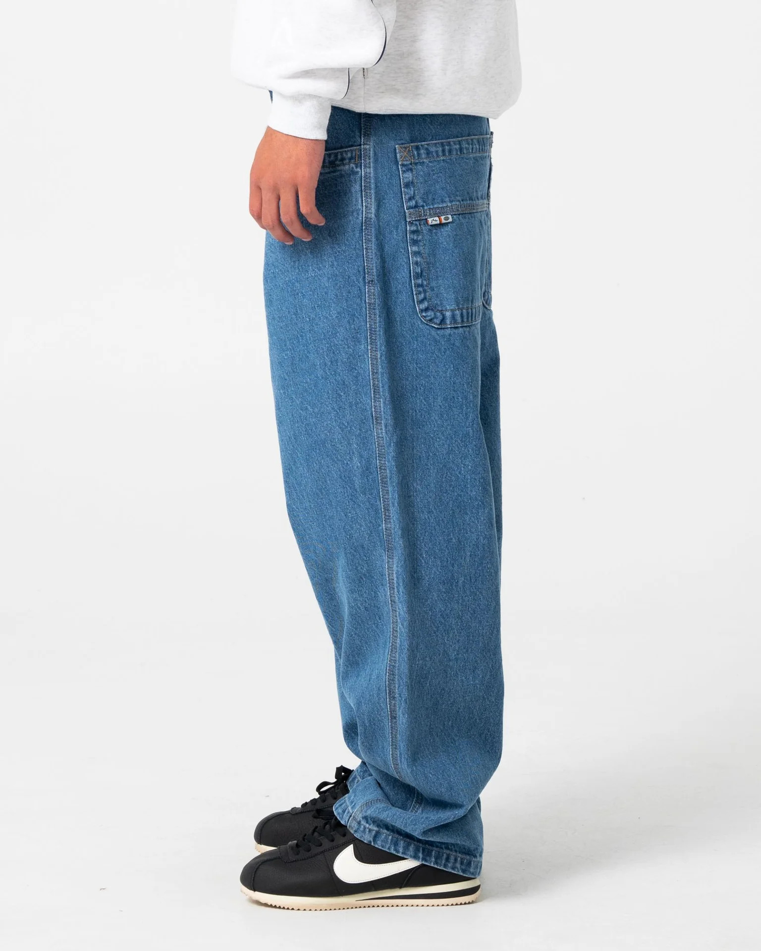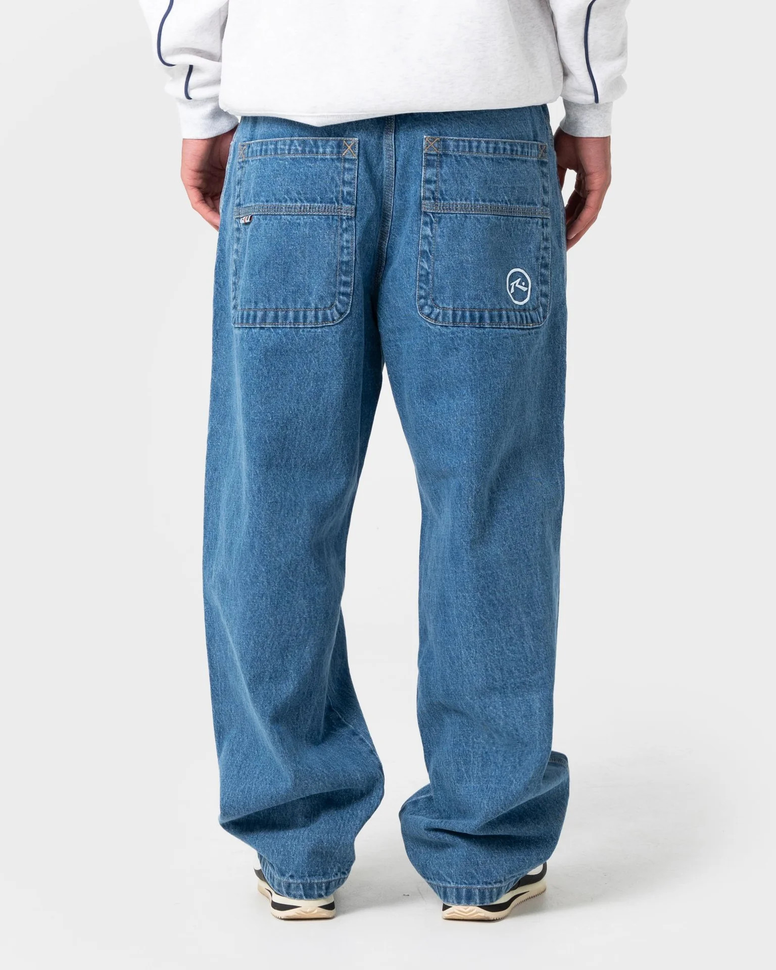 Baggy Fit Fitted Waist Jean With Rusty Embroidery. 100% Cotton Indigo Denim