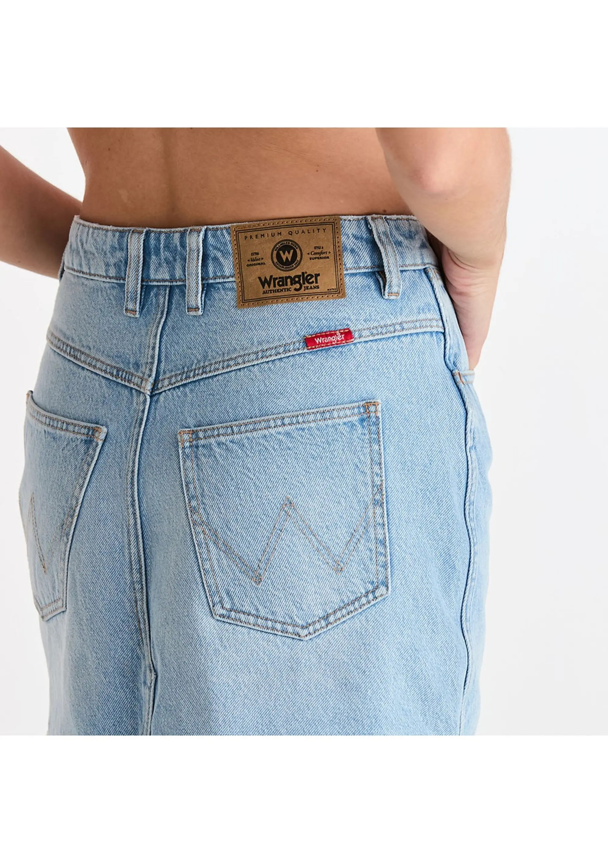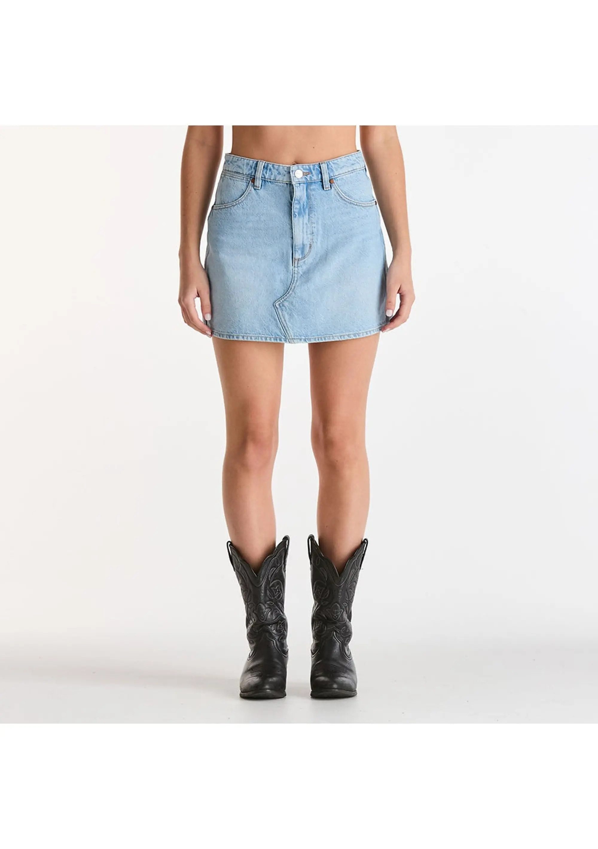 The Wrangler Repair Mini Skirt is our classic denim mini skirt. Designed to sit snug on the hips, with an A-line hem that finishes at upper thigh length. Made in a vintage mid indigo wash with a raw hem detail.